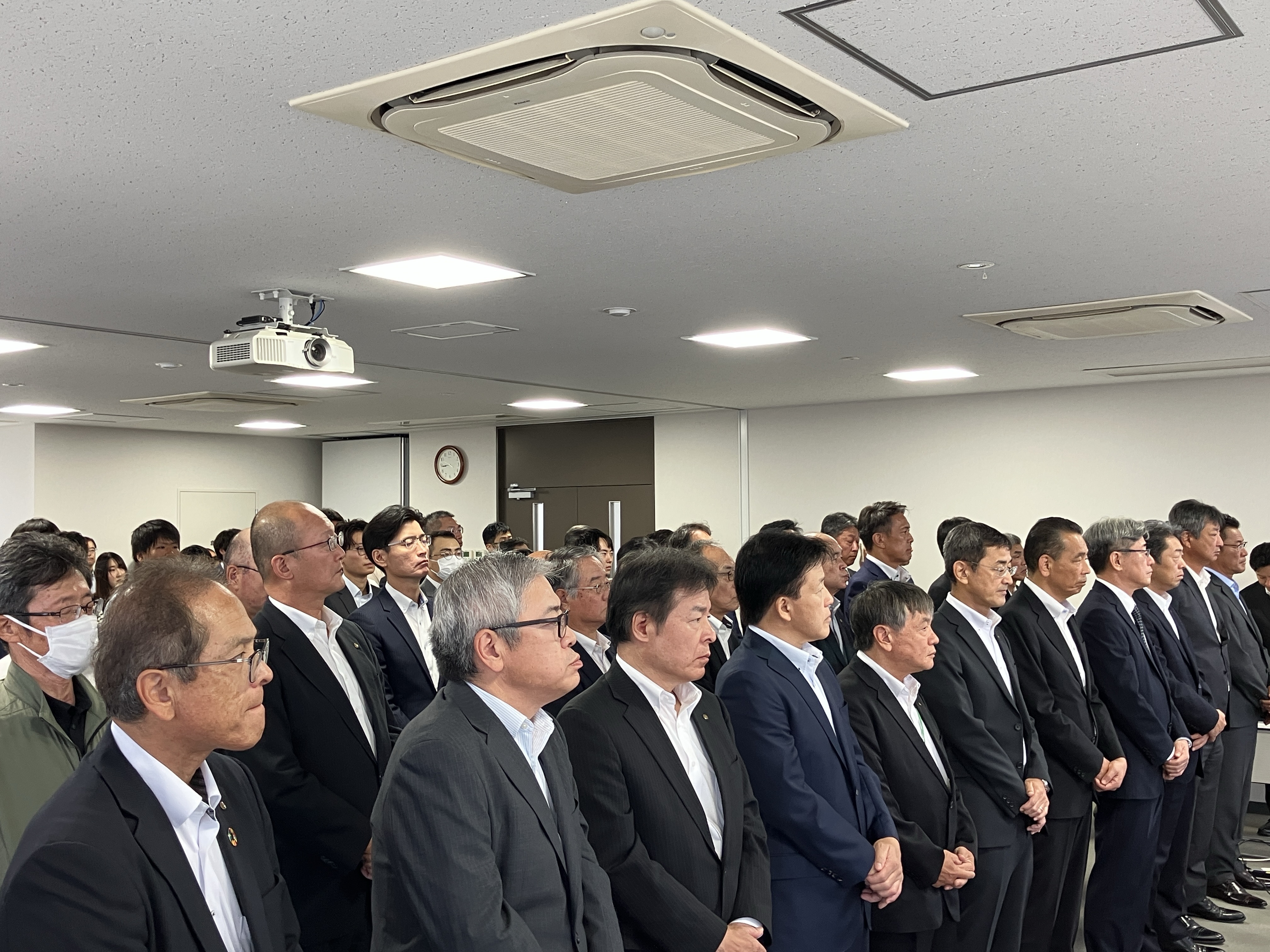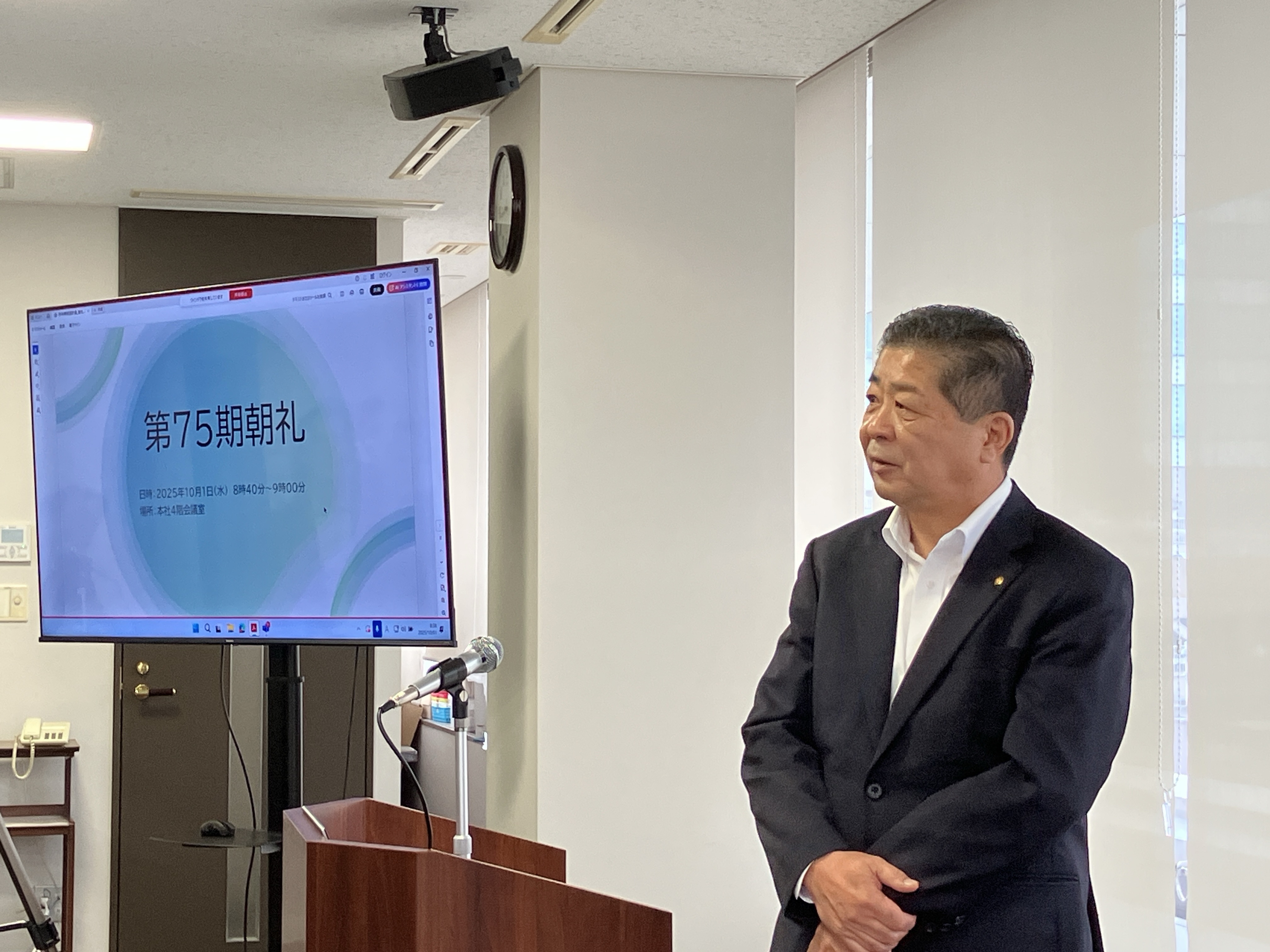 令和7年10月1日は加賀田組 75期の始まる日です。 新 中期経営計画の始期でもあります。 期首にあたり、各支店と中継を繋いで朝礼を行い、 馬場社長より新 中期経営計画の概要について説明がありました。 加賀田組はこれからも未来に向かって前進します! 今後とも、何卒よろしくお願い申し上げます。
